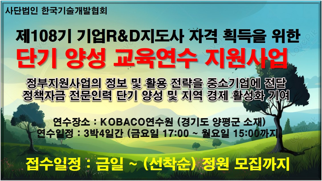 | » | 한국기술개발협회, 제108기 기업R&D지도사 자격 획득을 위한 단기 양성 교육연수 지원사업 공고 | 한국기술개발협 | 2025.08.09 | 58733 |
