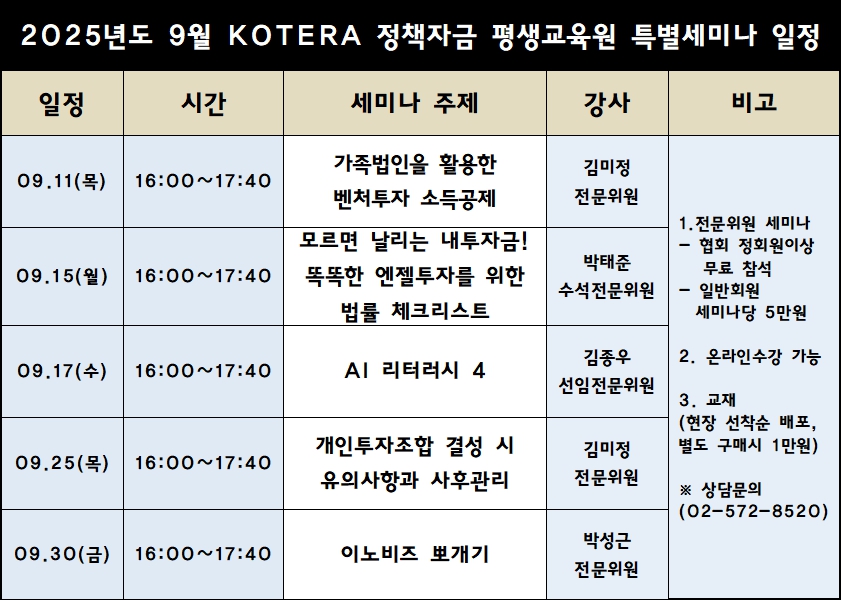9월 KOTERA 정책자금 평생교육원 특별강좌는 가족법인을 활용한 벤처투자소득공제, 모르면 날리는 내투자금! 똑똑한 엔젤투자를 위한 법률 체크리스트, AI리터러시 4, 개인투자조합 결성시 유의사항과 사후관리, 이노비즈 뽀개기 등 다양한 주제로 진행된다..