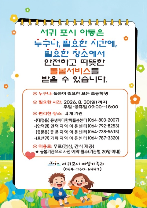 시정운영 7대 추진전략으로 2025년 5월부터 서귀포시에서만 중점 추진하고 있는 아동 틈새돌봄 시범사업은 주말뿐만 아니라 설, 추석 당일을 제외한 공휴일에(9시~18시) 돌봄이 가능하며 초등학생이면 누구나, 필요한 시간에, 편리한 장소에서 일시돌봄 서비스를 이용할 수 있다.