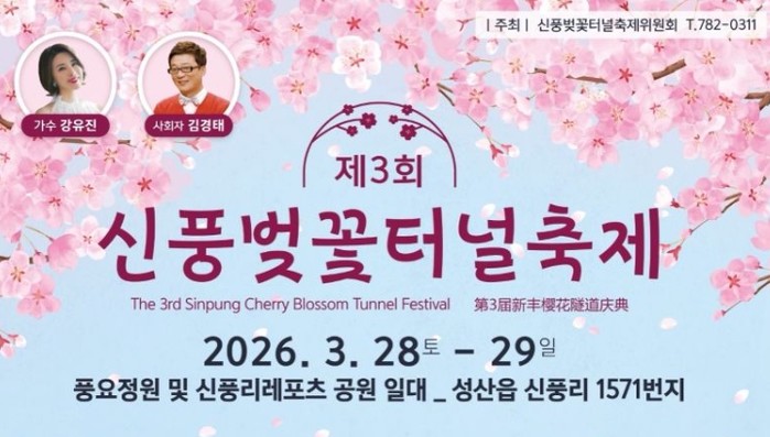 [파이낸셜경제=김영란 기자] 서귀포시는 몸과 마음이 가벼워지는 따스한 봄, 가족・연인・친구 간의 잊지 못할 추억을 선사할 제3회 신풍벚꽃터널축제가 28일~29일 양일간 성산읍 풍요정원 및 신풍리레포츠 공원 일원에서 개최된다고 밝혔다.