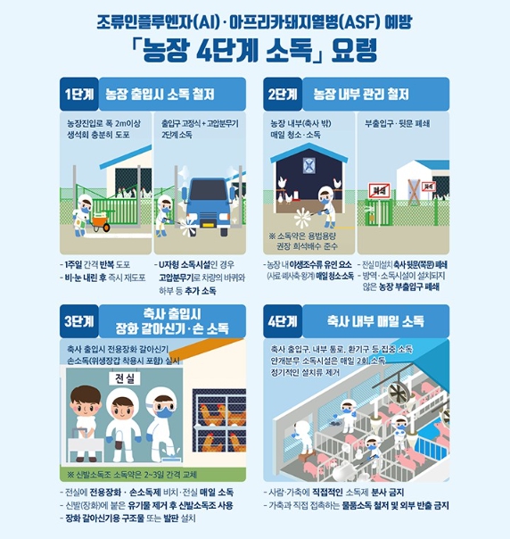 | ▲ 조류인플루엔자(AI)·아프리카돼지열병(ASF) 예방 농장 4단계 소독 요령' 안내문 |