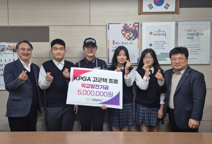 [파이낸셜경제=김영란 기자] 제주도교육청 남원중학교는 본교 동문인 프로골퍼 고군택 선수가 모교를 방문해 학교 발전기금 500만 원을 기탁했다고 27일 밝혔다.