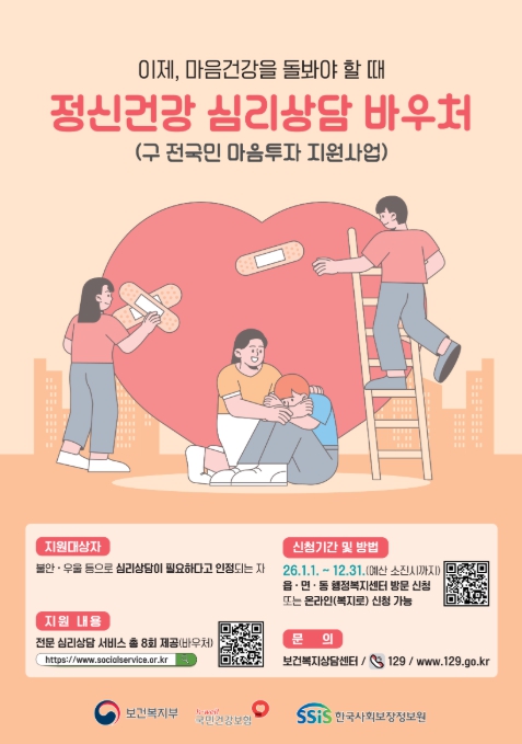 김철영 건강증진과장은 “정신건강 문제는 누구나 겪을 수 있는 만큼 조기에 상담과 도움을 받는 것이 중요하다”며, “심리적 어려움을 겪는 시민들이 심리상담 서비스를 통해 도움을 받길 바란다”고 말했다.