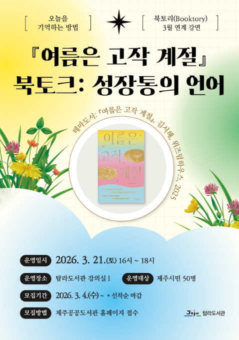 이번 강연은 주제 도서의 저자인 김서해 작가가 ‘북토크: 성장통의 언어’를 주제로 3월 21일 오후 4시 탐라도서관 강의실에서 진행한다.