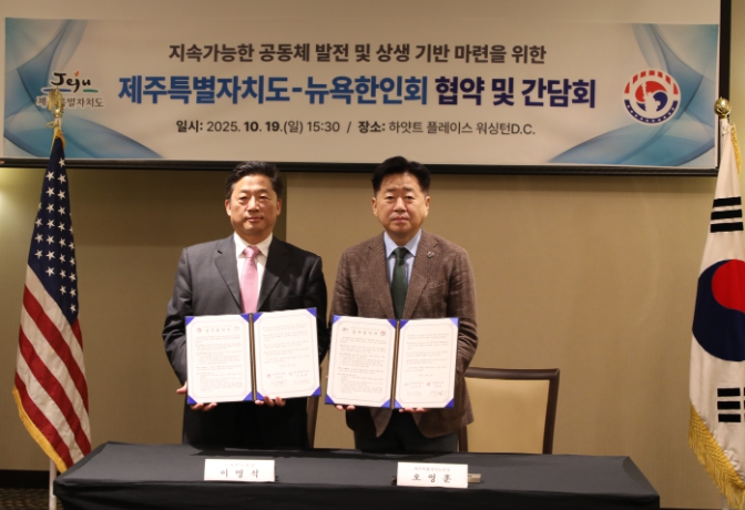 [파이낸셜경제=전병길 기자] 제주특별자치도가 미국 동부 50만 한인을 대표하는 뉴욕한인회와 손잡고 경제·관광·문화·교육 분야 글로벌 협력 네트워크를 본격 가동한다.