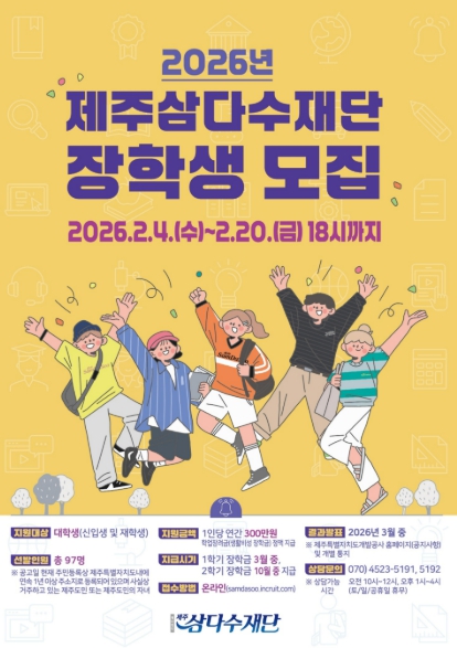 [파이낸셜경제=김영란 기자] 재단법인 제주삼다수재단(이사장 백경훈)이 제주와 대한민국의 미래를 이끌어갈 우수 인재 양성을 위해 2026년도 제주삼다수 장학생을 모집한다.
