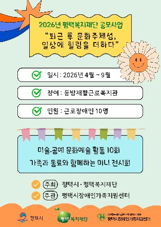 ‘퇴근 후 문화 충전, 일상에 힐링을 더하다’는 2026년 평택복지재단 우수 프로그램 공모사업에 선정된 사업으로, 평택시와 평택복지재단의 지원을 바탕으로 추진되는 지역사회 기반 복지사업이다. 지난 6일 오리엔테이션 및 약정식 체결을 시작으로 본격적인 운영이 시작된다.