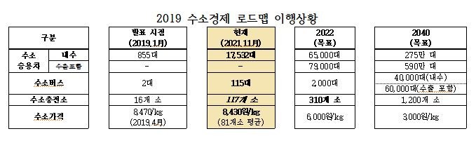 지난 2019년 정부가 발표한 수소경제 로드맵 이행상황이 지지부진하다는 분석이 제기됐다. 로드맵이 예정한 2022년 수소승용차 보급대수 목표는 누적 6만5천 대지만, 올해 11월 기준 27% 수준인 1만 7천 여 대에 불과한 실정이다. 핵심 인프라인 수소충전소 보급 일정도 목표 대비 38% 수준이다. 당장 내년에 전국 충전소 310개 소가 운영돼야 하지만 금년 11월 기준 117개 소가 운영되고 있다. 또 내년 목표 수소가격은 kg 당 6천 원이지만 현재 로드맵 발표시점과 큰 차이가 없는 8,400원대다.