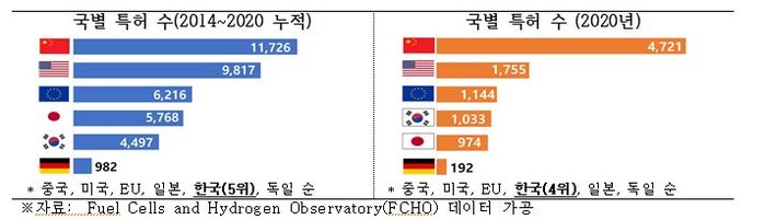 수소기술 특허 수를 살펴보면 주요 6개국(중, 미, EU, 일, 한, 독)의 특허 수는 2014년 이후 연평균 13.9%로 증가 추세다. 수소생산・연료전지 분야 특허 수(2014~2020 누적)에서 한국은 세계 5위 수준이다. 사실상 이 6개국(EU 포함)이 세계 수소시장 대부분을 차지하고 있어 실제 경쟁국 가운데 하위권에 속한다는 의미다.