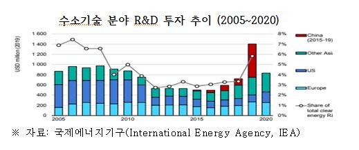 국제에너지기구(IEA)에 따르면 전 세계 수소 분야 R&D 투자는 2017년 이후 증가세다. 특히 중국 정부의 2019년 수소기술 연구개발비는 전년 대비 6배 급증하기도 했다. 중국 특허 수가 급증한 배경도 여기에 있다고 전경련은 분석했다.
