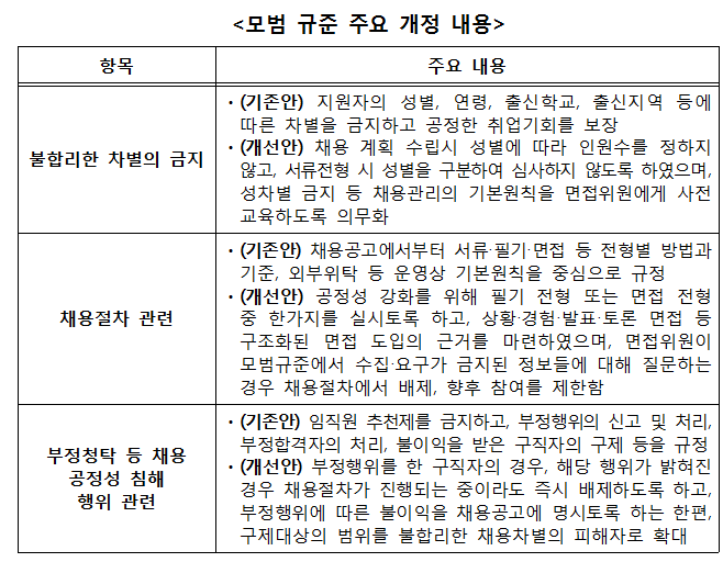 - 또한, 채용계획을 수립하면서 성별에 따른 인원수를 조정하거나 서류 전형에서 성별을 구분하여 심사하는 것을 금지하고, 면접위원은 성차별 금지에 관한 사전교육을 받도록 하는 등 성별에 따른 차별 금지를 강화했다.
