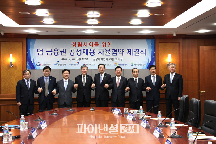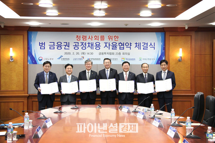 [파이낸셜경제]김윤정 기자= 이재갑 장관과 김태영 은행연합회 회장 등 6대 금융협회장*들은 2월 20일(목) 14시 30분 여의도 금융투자협회에서 공정채용의 민간부문 확산을 위한 「범 금융권 공정채용 자율협약」을 체결했다.