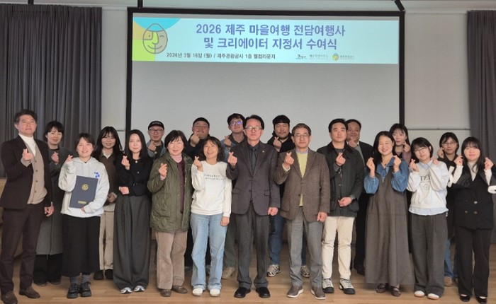 [파이낸셜경제=김영란 기자] 제주특별자치도와 제주관광공사(사장 고승철)은 3월 16일 월요일, 제주 웰컴센터에서 ‘2026 제주 마을 여행 전담 여행사 및 크리에이터’ 지정서 수여식을 개최하고 총 11개소를 공식 지정했다고 17일 밝혔다.