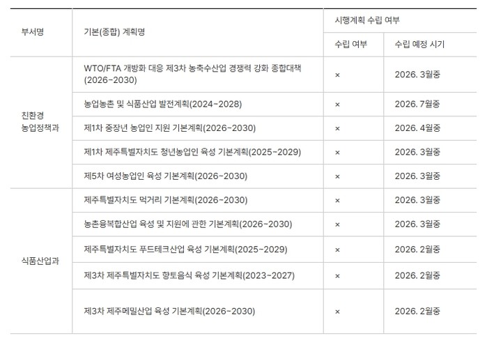[파이낸셜경제=김영란 기자] 제주특별자치도의회 농수축경제위원회 한권 의원(더불어민주당/일도1·이도1·건입)은 2026년 2월 10일 개최된 제446회 임시회 농축산식품국 주요업무보고 회의에서, “5년 단위 기본(종합)계획에 의거하여 매해 연도별로 수립되어야 하는 각종 시행계획들이 연초에 제때 수립되지 못함으로서, 의회가 계획의 적정성을 확인하지 못하고, ‘계획도 없이 집행’부터 하는 상황이 초래되고 있어, 개선이 시급하다”고 지적했다.