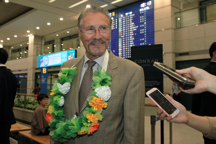 에밀 콘스탄티네스쿠(Emil Constantinescu) 루마니아 전(前) 대통령이 14일 인천국제공항을 통해 입국하며 취재진의 질문을 받고 있다. 2018.9.14 박완희 기자 orange1419@daum.net